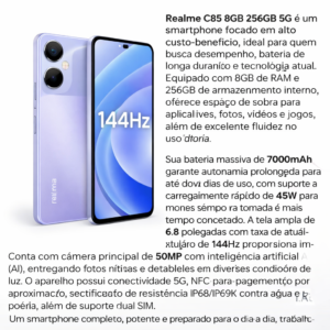Realme C85 8GB 256GB 5G NFC Tela 6.8″ 144Hz Câmera 50MP AI Bateria 7000mAh 45W Dual SIM IP68/IP69K